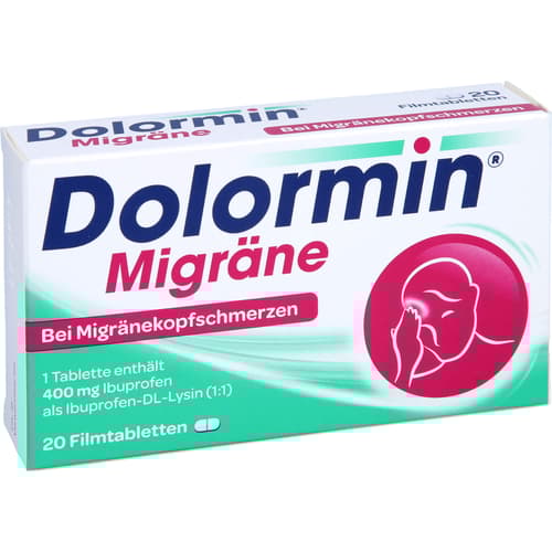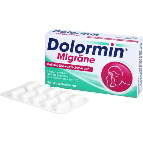 Dolormin Migräne Filmtabletten 400 mg Filmtabletten. Wirkstoff: Ibuprofen als Ibuprofen-DL-Lysin (1:1). Anwendungsgebiete: Zur symptomatischen Behandlung der akuten Kopfschmerzphase bei Migräne mit und ohne Aura.Zu Risiken und Nebenwirkungen lesen Sie die Packungsbeilage und fragen Sie Ihre Ärztin, Ihren Arzt oder in Ihrer Apotheke.
