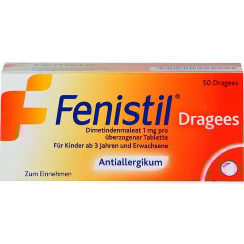 Fenistil Dragees, überzogene Tabletten. Wirkstoff: Dimetindenmaleat. Anwendungsgebiete: zur symptomatischen Linderung von histaminbedingtem Juckreiz; windpockenassoziiertem Juckreiz bei Kleinkindern; allergischem Schnupfen bei Patienten über 6 Jahren; Nesselsucht (Urtikaria).Zu Risiken und Nebenwirkungen lesen Sie die Packungsbeilage und fragen Sie Ihre Ärztin, Ihren Arzt oder in Ihrer Apotheke.
