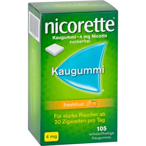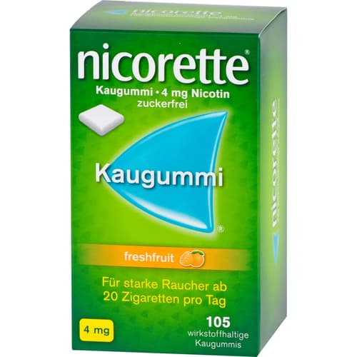 Nicorette Kaugummi 4 mg freshfruit, wirkstoffhaltiges Kaugummi. Wirkstoff: Nicotin (als Nicotin-Polacrilin (1:4)). Anwendungsgebiete: Behandlung der Tabakabhängigkeit durch Linderung der Entzugserscheinungen. Unterstützung der Raucherentwöhnung. Auch zur Verringerung des Zigarettenkonsums (Rauchreduktion), um auf diesem Weg den Rauchausstieg zu erreichen. Warnhinweis: Enthält Levomenthol, Pfefferminzöl, Butylhydroxytoluol (E 321).Zu Risiken und Nebenwirkungen lesen Sie die Packungsbeilage und fragen Sie Ihre Ärztin, Ihren Arzt oder in Ihrer Apotheke.