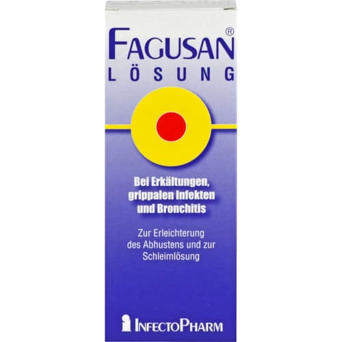 Fagusan Lösung. Wirkstoff: Guaifenesin. Anwendungsgebiete: zur Schleimlösung im Bronchialbereich und zur Erleichterung des Abhustens bei Erkältungen und grippalen Infekten und/oder Entzündung der Bronchien (Bronchitis). Warnhinweis: Enthält 11 Vol.-% Alkohol!Zu Risiken und Nebenwirkungen lesen Sie die Packungsbeilage und fragen Sie Ihre Ärztin, Ihren Arzt oder in Ihrer Apotheke.