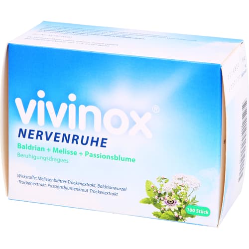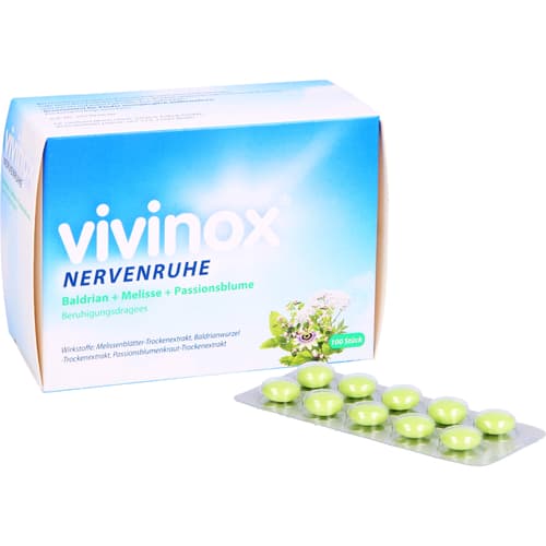 Vivinox Nervenruhe Baldrian + Melisse + Passionsblume Beruhigungsdragees 112,5 mg / 125 mg / 80 mg überzogene Tabletten. Anwendungsgebiete: Unruhezustände und nervös bedingte Einschlafstörungen. Warnhinweise: Enthält Glucose und Sucrose.Zu Risiken und Nebenwirkungen lesen Sie die Packungsbeilage und fragen Sie Ihre Ärztin, Ihren Arzt oder in Ihrer Apotheke.