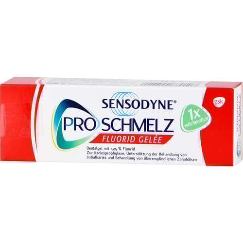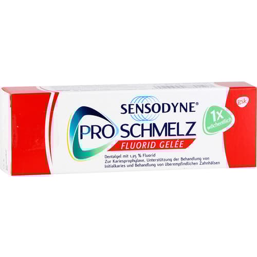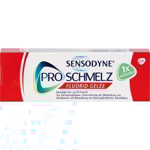 Sensodyne Proschmelz Fluorid Gelée. Wirkstoff: Natriumfluorid. Anwendungsgebiete: Vorbeugung der Karies, Unterstützung zur Behandlung der Initialkaries und Behandlung überempfindlicher Zahnhälse.Zu Risiken und Nebenwirkungen lesen Sie die Packungsbeilage und fragen Sie Ihre Ärztin, Ihren Arzt oder in Ihrer Apotheke.