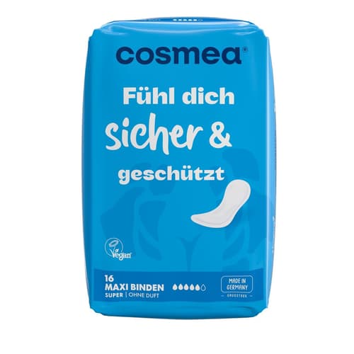 Die Cosmea Comfort Plus Maxi 3D super core Binde bietet zuverlässigen Schutz und hohen Tragekomfort. Mit ihrer atmungsaktiven und seidig-weichen Oberfläche sowie dem seitlichen Auslaufschutz und der Wäscheschutzfolie sorgt sie für ein rundum sicheres Gefühl. Diese dermatologisch mit "sehr gut" getestete Binde wird in Deutschland hergestellt und kommt im praktischen 16er-Pack.