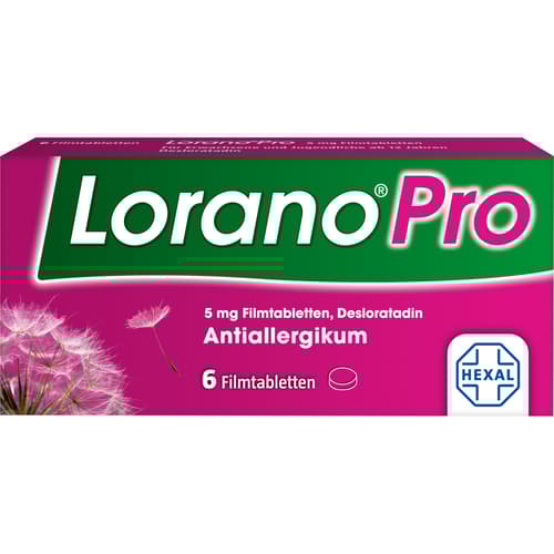 Lorano Pro 5 mg Filmtabletten. Wirkstoff: Desloratadin. Anwendungsgebiete: bessert die Symptome bei allergischer Rhinitis (durch eine Allergie hervorgerufene Entzündung der Nasengänge, beispielsweise Heuschnupfen oder Hausstaubmilben-Allergie); zur Besserung der Symptome bei Urtikaria (ein durch eine Allergie hervorgerufener Hautzustand).Zu Risiken und Nebenwirkungen lesen Sie die Packungsbeilage und fragen Sie Ihre Ärztin, Ihren Arzt oder in Ihrer Apotheke.
