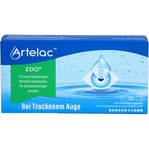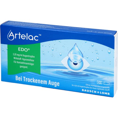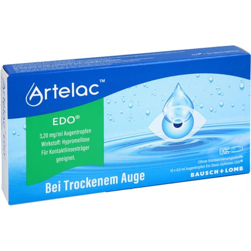 Artelac EDO 3,20 mg/ml Augentropfen, Lösung. Wirkstoff: Hypromellose. Anwendungsgebiete: Zur symptomatischen Behandlung von Austrocknungserscheinungen der Horn- und Bindehäute (Trockenes Auge) durch Tränensekretions- und Tränenfunktionsstörungen infolge lokaler oder systemischer Erkrankungen sowie bei mangelndem oder unvollständigem Lidschluss, was sich z. B. in Augenbrennen, Fremdkörpergefühl und Lichtscheu bei Wind, Hitze und Ermüdung äußern kann. Zur Benetzung und Nachbenetzung weicher und harter Kontaktlinsen. Warnhinweise: Enthält Phosphate.Zu Risiken und Nebenwirkungen lesen Sie die Packungsbeilage und fragen Sie Ihre Ärztin, Ihren Arzt oder in Ihrer Apotheke.