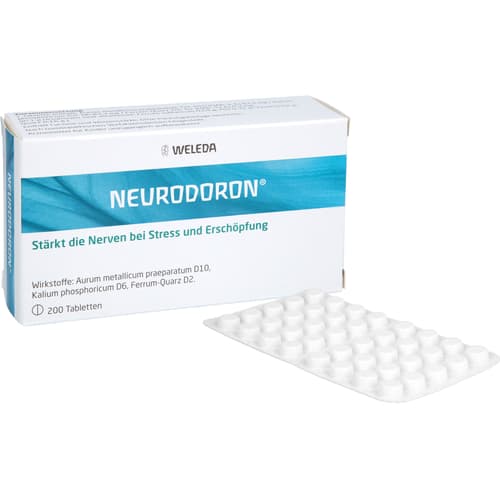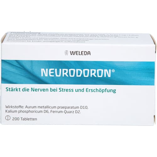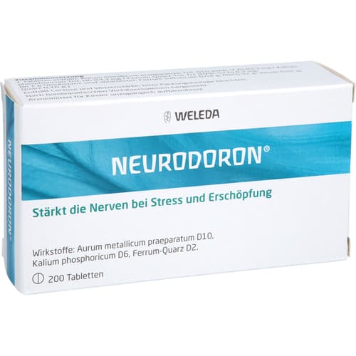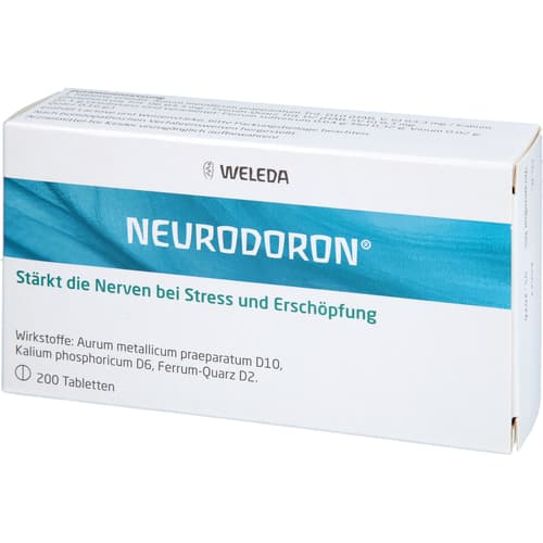 Weleda Neurodoron Tabletten. Anwendungsgebiete: Gemäß der anthroposophischen Menschen- und Naturerkenntnis gehören zu den Anwendungsgebieten die Harmonisierung und die Stabilisierung des Wesensgliedergefüges bei nervöser Erschöpfung und Stoffwechselschwäche, z.B. Nervosität, Angst- und Unruhezustände, depressive Verstimmung, Rekonvaleszenz, Kopfschmerzen. Warnhinweis: Dieses Arzneimittel enthält Lactose.Zu Risiken und Nebenwirkungen lesen Sie die Packungsbeilage und fragen Sie Ihre Ärztin, Ihren Arzt oder in Ihrer Apotheke.