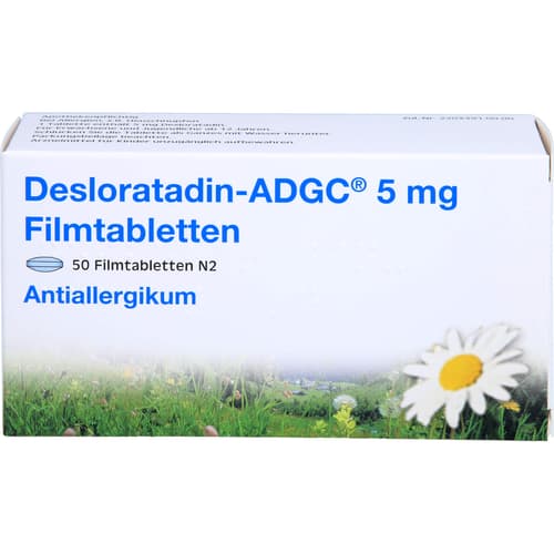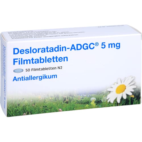 Desloratadin ADGC 5 mg Filmtabletten. Wirkstoff: Desloratadin. Anwendungsgebiete: bessert die Symptome bei allergischer Rhinitis (durch eine Allergie hervorgerufene Entzündung der Nasengänge, beispielsweise Heuschnupfen oder Hausstaubmilben-Allergie) bei Erwachsenen und Jugendlichen ab 12 Jahren; Linderung der Symptome einer Urtikaria (durch eine Allergie hervorgerufener Hautzustand).Quelle: Angaben der Packungsbeilage
