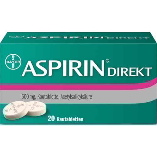 Aspirin Direkt 500mg, Kautabletten. Wirkstoff: Acetylsalicylsäure. Anwendungsgebiete: bei leichten bis mäßig starken Schmerzen wie Kopfschmerzen, Zahnschmerzen, Regelschmerzen, schmerzhafte Beschwerden, die im Rahmen von Erkältungskrankheiten auftreten (z.B. Kopf-, Hals- und Gliederschmerzen) und bei Fieber.Zu Risiken und Nebenwirkungen lesen Sie die Packungsbeilage und fragen Sie Ihre Ärztin, Ihren Arzt oder in Ihrer Apotheke.