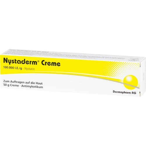 Nystaderm Creme 100.000 I.E./g. Wirkstoff: Nystatin. Anwendungsgebiete: Nachgewiesene Nystatin-empfindliche Hefepilzinfektionen der Haut, insbesondere mit Beteiligung von Candida spp., wie z. B. Windelcandidose. Warnhinweis: Enthält Methyl-4-Hydroxybenzoat, Cetylalkohol und 100 mg Propylenglykol pro 1 g Creme.Zu Risiken und Nebenwirkungen lesen Sie die Packungsbeilage und fragen Sie Ihre Ärztin, Ihren Arzt oder in Ihrer Apotheke.