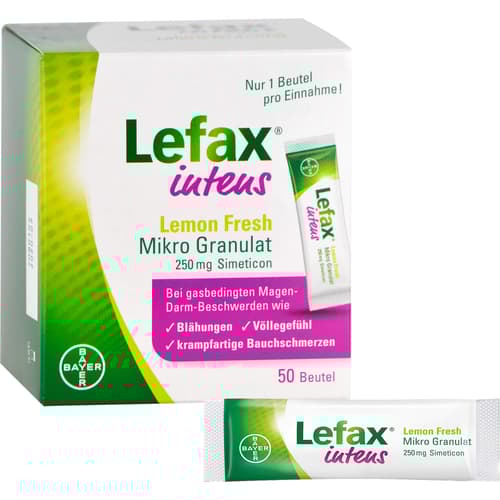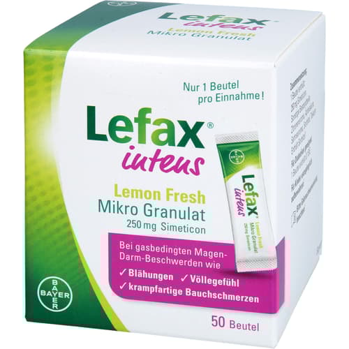 Lefax intens Lemon Fresh Mikro Granulat. Wirkstoff: 250 mg Simeticon. Anwendungsgebiete: zur Linderung und symptomatischen Behandlung gasbedingter Magen-Darm-Beschwerden wie Blähungen (Meteorismus), Völlegefühl, krampfartige Bauchschmerzen, Oberbauchschmerzen, Aufstoßen und bei funktioneller Dyspepsie und zur Vorbereitung der Diagnostik im Bauchbereich, wie z.B. Endoskopie, Röntgen und Sonographie.Zu Risiken und Nebenwirkungen lesen Sie die Packungsbeilage und fragen Sie Ihre Ärztin, Ihren Arzt oder in Ihrer Apotheke.