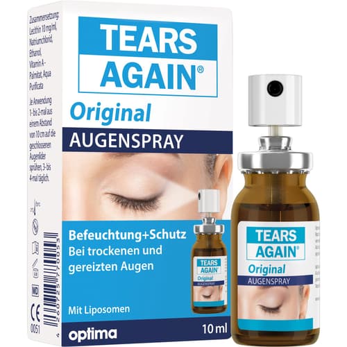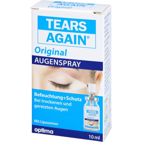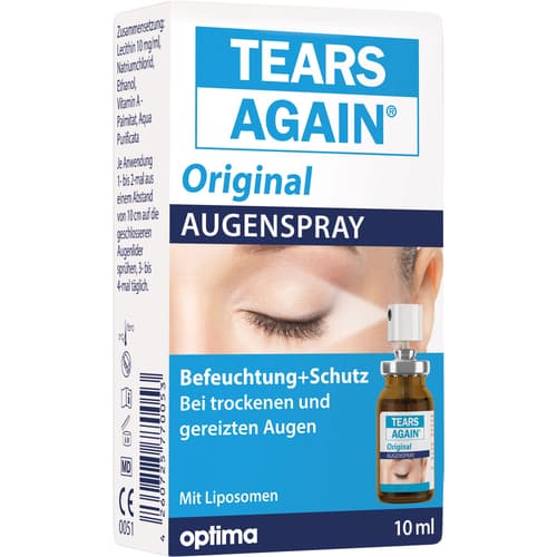 Tears Again Augenspray stabilisiert die Lipidschicht am Tränenfilm, reguliert und verbessert die Befeuchtung der Augenoberfläche und der Augenlider. Anzuwenden bei umweltbedingten Befindlichkeitsstörungen wie trockenen Augen, Spannungsgefühl der Augenlider, Fremdkörpergefühl, Brennen und Jucken der Augen.Gegenanzeigen