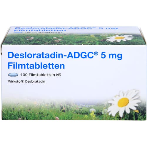 Desloratadin ADGC 5 mg Filmtabletten. Wirkstoff: Desloratadin. Anwendungsgebiete: bessert die Symptome bei allergischer Rhinitis (durch eine Allergie hervorgerufene Entzündung der Nasengänge, beispielsweise Heuschnupfen oder Hausstaubmilben-Allergie) bei Erwachsenen und Jugendlichen ab 12 Jahren; Linderung der Symptome einer Urtikaria (durch eine Allergie hervorgerufener Hautzustand).Quelle: Angaben der Packungsbeilage