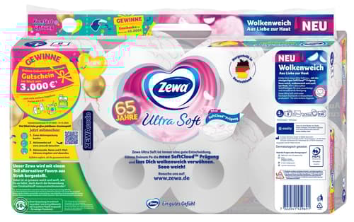 Zewa Ultra Soft Toilettenpapier ist, dank der extra-weichen Wohlfühllagen, sanft zur Haut und reinigt zuverlässig. Das 4-lagige Toilettenpapier, mit zartrosa Federmuster, bietet hochwertige Qualität und Komfort für den besonderen Verwöhnmoment.