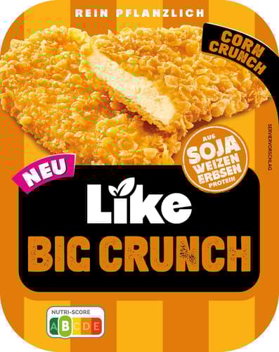Du willst mehr? Mehr Biss, mehr Saftigkeit, mehr Geschmack? LIKE Big Crunch liefert dir genau das: eine großzügige, goldbraun knusprige Hülle und ein zarter Kern auf pflanzlicher Basis. Außen herrlich crunchy, innen angenehm saftig – ein echtes Highlight für deinen Teller.