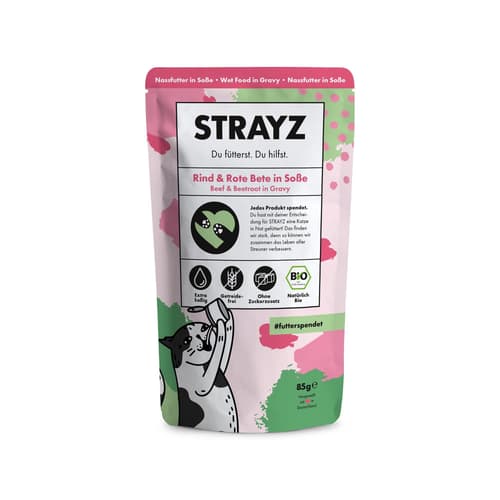 STRAYZ Katze Nassfutter Soße Rind & Rote Bete Bio ist ein feines Ragout in Soße – ideal für wählerische Katzen, die es saftig und aromatisch mögen. Getreidefrei und ohne Zucker, Binde- oder Konservierungsmittel.