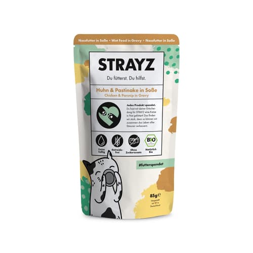 STRAYZ Katze Nassfutter Soße Huhn & Pastinake Bio ist ein feines Ragout in Soße – gemacht für Katzen, die beim Napf gern wählerisch sind. Zarte Stückchen treffen auf eine aromatische Soße mit Bio-Huhn und Pastinake.