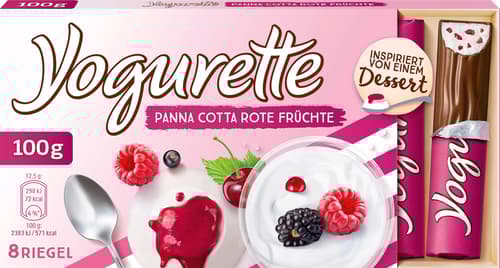 EU,Yogurette Panna Cotta Rote Früchte ist ein Schokoriegel in Stickform mit Joghurtcreme-Füllung und fruchtiger Note. Umhüllt von Schokolade verbindet er cremige Panna-Cotta-Anklänge mit roten Früchten.