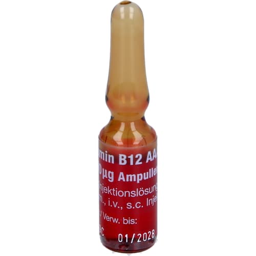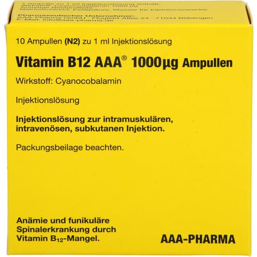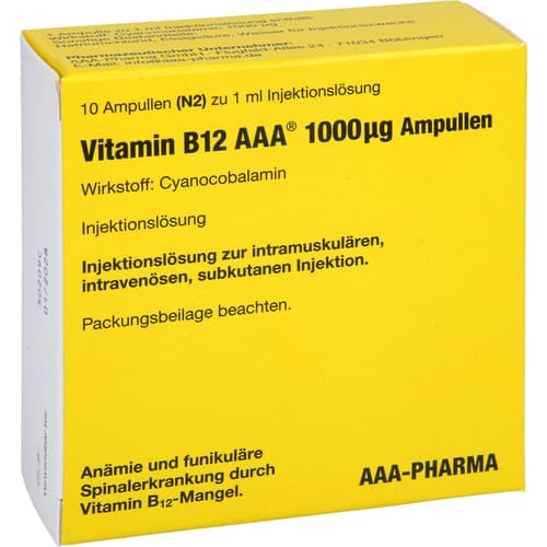Vitamin B12 AAA 1.000 µg Ampullen. Wirkstoff: Cyanocobalamin. Anwendungsgebiete: bei Vitamin B12-Mangel, der ernährungsmäßig nicht behoben werden kann.Zu Risiken und Nebenwirkungen lesen Sie die Packungsbeilage und fragen Sie Ihre Ärztin, Ihren Arzt oder in Ihrer Apotheke.