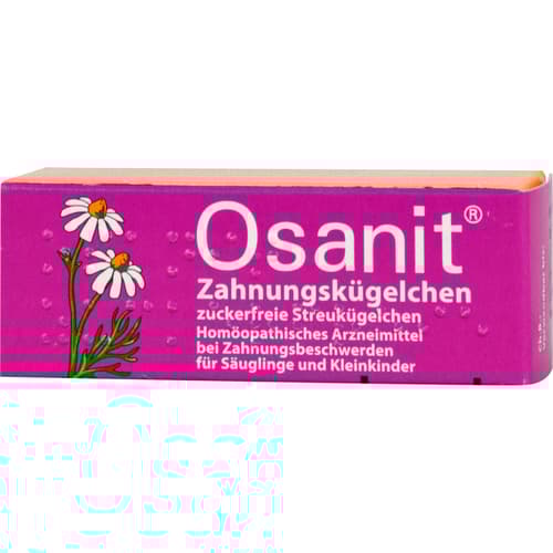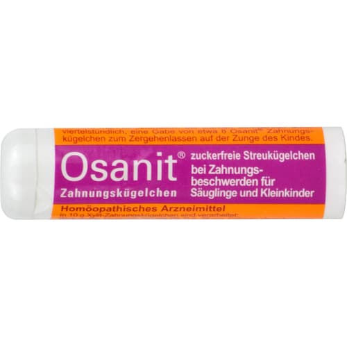 Osanit Zahnungskügelchen. Anwendungsgebiete: Die Anwendungsgebiete leiten sich von den homöopathischen Arzneimittelbildern ab. Für dieses Arzneimittel sind folgende Anwendungsgebiete zugelassen: Zahnungsbeschwerden bei Kindern verbunden mit Schmerzzuständen, Zahnungsfieber, Zahnungsdurchfall, reizbaren Verstimmungszuständen, Unruhe und Schlaflosigkeit.Zu Risiken und Nebenwirkungen lesen Sie die Packungsbeilage und fragen Sie Ihre Ärztin, Ihren Arzt oder in Ihrer Apotheke.