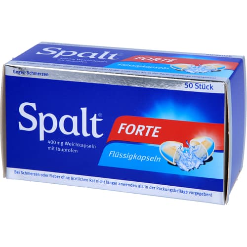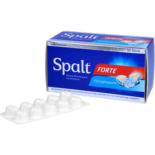 Spalt Forte, 400 mg Weichkapseln. Wirkstoff: Ibuprofen. Anwendungsgebiete: Für Erwachsene zur kurzzeitigen symptomatischen Behandlung von leichten bis mäßig starken Schmerzen wie Kopfschmerzen, Zahnschmerzen, Regelschmerzen; Fieber. Warnhinweis: Enthält Sorbitol.Zu Risiken und Nebenwirkungen lesen Sie die Packungsbeilage und fragen Sie Ihre Ärztin, Ihren Arzt oder in Ihrer Apotheke.
