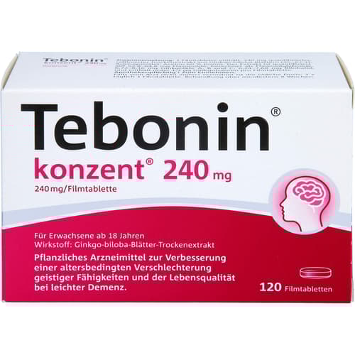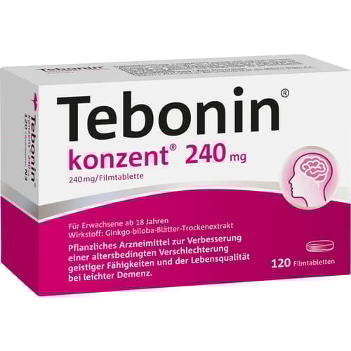 Tebonin konzent 240 mg Filmtabletten. Wirkstoff: Ginkgo-biloba-Blätter-Trockenextrakt. Anwendungsgebiete: als pflanzliches Arzneimittel zur Besserung von (alters-assoziierten) geistigen Leistungseinbußen und zur Verbesserung der Lebensqualität bei leichter Demenz.Zu Risiken und Nebenwirkungen lesen Sie die Packungsbeilage und fragen Sie Ihre Ärztin, Ihren Arzt oder in Ihrer Apotheke.