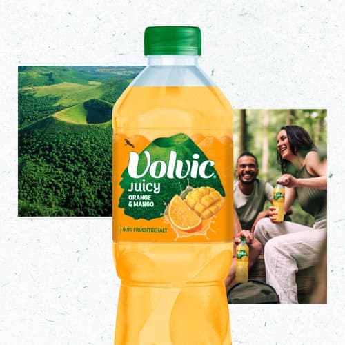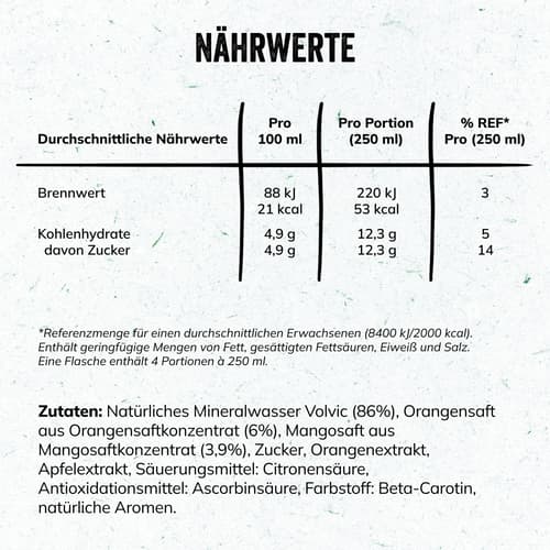 Zutaten: Natürliches Mineralwasser Volvic (83%), Orangensaft aus Orangensaftkonzentrat (5,5%), Mangosaft aus Mangosaftkonzentrat (4,5%), Zucker, Orangenextrakt, Apfelextrakt, Säuerungsmittel: Citronensäure, Antioxidationsmittel: Ascorbinsäure, natürliches Aroma, Farbstoff: Beta-Carotin.