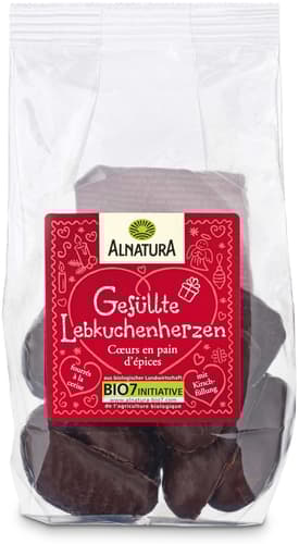 Bio-Lebkuchen in Herzformat, mit Sauerkirschfüllung und einem Überzug aus Zartbitterschokolade.