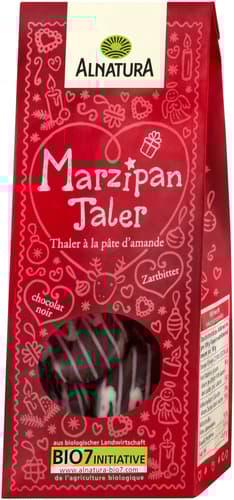 Kleine Taler aus süß-aromatischem Marzipan und einem Zartbitterschokoladen-Überzug. Weihnachtsgenuss in Bio-Qualität.