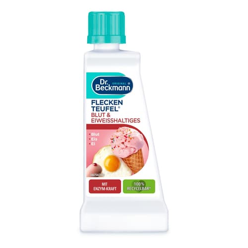 Der Dr. Beckmann Fleckenteufel Blut und Eiweißhaltiges arbeitet mit einer aktiven Fleck-Bindungs-Formel auf enzymatischer Basis. Die enthaltenen Enzyme sind hochwirksame Eiweiße (auch Proteine genannt) und funktionieren nach dem Schlüssel-Schloss-Prinzip. Das heißt, dass der Fleck und der Fleckenlöser von der Struktur genau zusammenpassen müssen. Das verwendete Enzym reagiert somit nur mit den im Fleck enthaltenen Eiweißen und spaltet deren langkettigen Moleküle in kleine Bestandteile auf. Bei der Reinigung von Textilien unterstützen damit Enzyme den Abbau organischer Verschmutzungen (Blutflecken, Spermaflecken oder Ei, etc). Dieser Vorgang benötigt ein bisschen Zeit. Je nachdem wie lange man die Fleckenteufel-Formel einwirken lässt, werden so selbst eingetrocknete und hartnäckige Blutflecken, Ei oder Eis aufgespalten. Ideal für Flecken von: Blut Dosenmilch Ei Eierlikör Eierspeisen Eis Eiter Joghurt Milch Pudding Quark Sahne Speichel Sperma Stärke Tsatziki Nicht geeignet für: Teppiche Leder Kaschmir Anwendung: Fleck mit Fleckenteufel-Flüssigkeit gut durchfeuchten. 5-10 Min. einwirken lassen. Textil wie gewohnt waschen. Bei nicht waschbaren Textilien: Fleckstelle nach Fleckentfernung mit feuchtem Tuch vollständig austupfen. Anwendung bei größeren Flecken: Einweichen: Gesamtes Pulver in 7 l warmem Wasser vollständig auflösen. Textil komplett einige Stunden einlegen. Danach gründlich ausspülen und wie gewohnt waschen. Bei besonders hartnäckigen Flecken: Flüssigkeit länger einwirken lassen. Wichtige Hinweise: - Vorab Farbe und Beständigkeit an verdeckter Gewebestelle prüfen. - Blutflecken und eiweißhaltige Flecken nur mit kaltem Wasser behandeln. Wärme fixiert Blut und Eiweiß sonst im Gewebe. - Bitte den Fleck vor dem Waschen behandeln und einwirken lassen, bis Fleck gelöst ist. - Je früher ein Fleck behandelt wird, desto leichter lässt er sich entfernen. - Fleckbehandlung immer vor dem Waschen durchführen. - Den mit Fleckenteufel-Flüssigkeit behandelten Fleck während der Produktanwendung nicht austrocknen lassen. - Pflegesymbole der Textilien beachten. - Fleckbehandlung nicht auf empfindlichen Oberflächen durchführen. - Geeignete Unterlage, z.B. Untertasse und sauberes Tuch, verwenden.