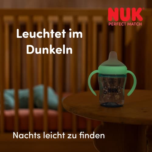 Auch nachts ist auf die Perfect Match Trinklernflasche Verlass: Die Flasche ist auslaufsicher – für entspannte Nächte und ruhige Eltern. Und damit Babys sie auch im Dunkeln selbstständig finden können, leuchtet sie an den Griffen sanft in der Nacht. Einfach tagsüber unter eine Lampe oder ins Sonnenlicht stellen – das spezielle Material speichert das Licht und gibt es nachts in Form eines sanften Leuchtens wieder ab.