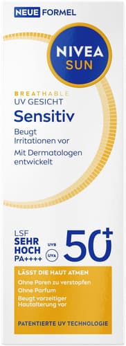 Die NIVEA SUN UV Gesicht Sensitive Creme LSF 50+ bietet sehr hohen Sonnenschutz für empfindliche Gesichtshaut mit Lichtschutzfaktor 50+. Diese Creme ist speziell auf sensibler Haut abgestimmt und sorgt für Schutz vor UVA‑ und UVB‑Strahlen mit einer sanften, gut verträglichen Formel.