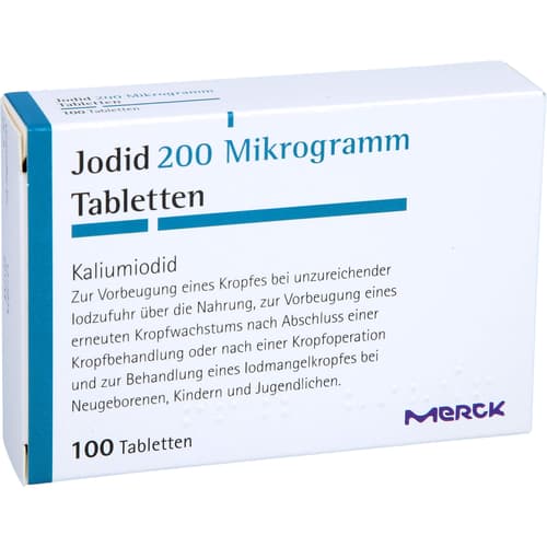 Jodid 200 Mikrogramm. Wirkstoff: Kaliumiodid. Anwendungsgebiete: zur Vorbeugung eines Kropfes bei unzureichender Iodzufuhr über die Nahrung, insbesondere in Schwangerschaft und Stillzeit; zur Vorbeugung eines erneuten Kropfwachstums nach Abschluss einer Kropfbehandlung oder nach einer Kropfoperation; zur Behandlung eines Iodmangelkropfes bei Neugeborenen, Kindern und Jugendlichen.Zu Risiken und Nebenwirkungen lesen Sie die Packungsbeilage und fragen Sie Ihre Ärztin, Ihren Arzt oder in Ihrer Apotheke.