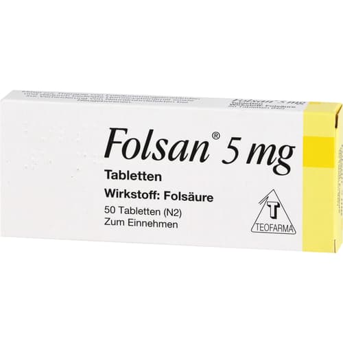 Folsan 5mg Tabletten. Wirkstoff: Folsäure. Anwendungsgebiete: angewendet zur: Therapie von Folsäuremangelzuständen, die diätetisch nicht behoben werden können; zur Verhinderung von Neuralrohrdefekten bei Neugeborenen durch vorbeugende Behandlung von Frauen mit einem erhöhten Risiko (z. B. wenn zuvor ein Kind mit Neuralrohrdefekt geboren wurde oder bei Frauen, die an Krampfanfällen leiden und mit Antiepileptika behandelt werden). Die Einnahme von Folsäure ist auch bei vollwertiger Ernährung angezeigt; zur Behandlung erhöhter Konzentrationen von Homocystein im Blut, die durch Folsäuremangel bedingt sind.Zu Risiken und Nebenwirkungen lesen Sie die Packungsbeilage und fragen Sie Ihre Ärztin, Ihren Arzt oder in Ihrer Apotheke.