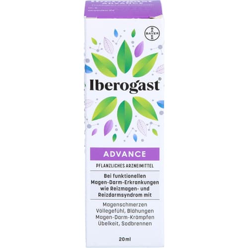 Iberogast Advance Flüssigkeit zum Einnehmen. Wirkstoffe: Auszug aus: Frischer, bitterer Schleifenblume-Ganzpflanze, Kamillenblüten, Kümmelfrüchten, Melissenblättern, Pfefferminzblättern, Süßholzwurzeln. Anwendungsgebiete: Zur Behandlung von funktionellen Magen-Darm-Erkrankungen wie Reizmagensyndrom (funktionelle Dyspepsie) und Reizdarmsyndrom (Colon irritabile). Warnhinweis: Enthält 31 Vol.-% Alkohol!Quelle: Angaben der Packungsbeilage