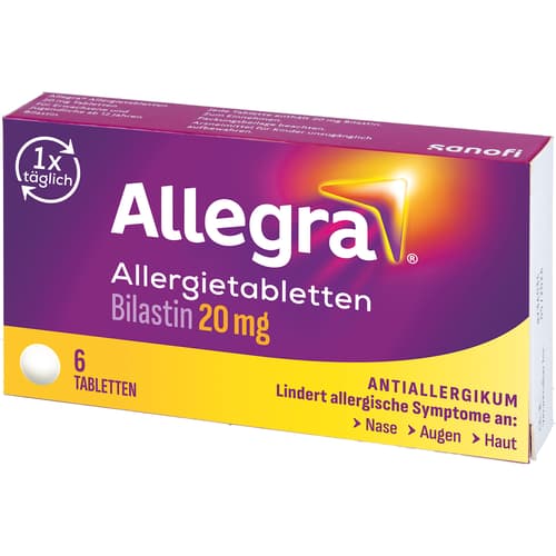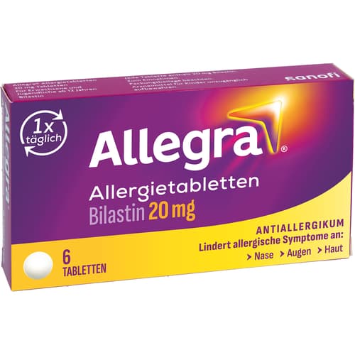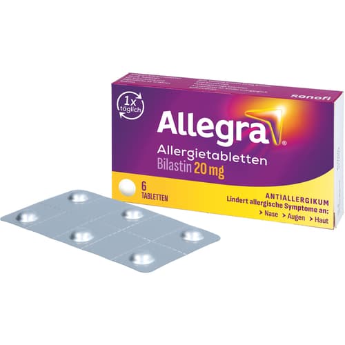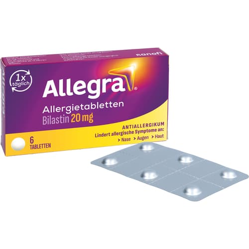 Allegra Allergietabletten 20 mg Tabletten. Wirkstoff: Bilastin. Anwendungsgebiete: Allegra Allergietabletten werden angewendet, um die Beschwerden von allergischer Rhinokonjunktivitis (Niesen, juckende, laufende, verstopfte Nase und rote und tränende Augen) bei saisonalen Formen (z. B. Heuschnupfen) sowie bei ganzjährigen Formen (z. B. Hausstaubmilbenallergie) zu lindern. Sie können auch angewendet werden, um juckende Hautausschläge (Nesselsucht oder Urtikaria) zu behandeln.Zu Risiken und Nebenwirkungen lesen Sie die Packungsbeilage und fragen Sie Ihre Ärztin, Ihren Arzt oder in Ihrer Apotheke.