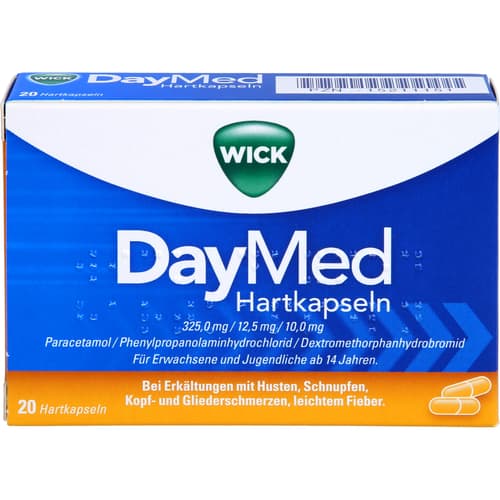 Wick DayMed Hartkapseln. Anwendungsgebiete: bei Erkältungskrankheiten mit Husten, Schnupfen, Kopf- und Gliederschmerzen, leichtem Fieber.Zu Risiken und Nebenwirkungen lesen Sie die Packungsbeilage und fragen Sie Ihre Ärztin, Ihren Arzt oder in Ihrer Apotheke.