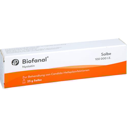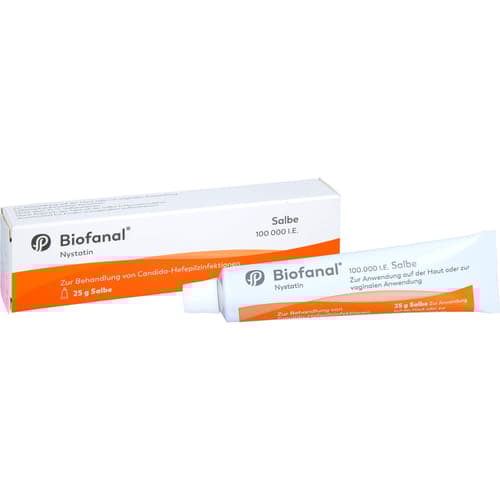 Biofanal Salbe. Wirkstoff: Nystatin. Anwendungsgebiet: Zur Behandlung von Candida-Infektionen der Haut und der Vaginalschleimhaut, insbesondere Intertrigo, Paronychie und Interdigitalmykose.Zu Risiken und Nebenwirkungen lesen Sie die Packungsbeilage und fragen Sie Ihre Ärztin, Ihren Arzt oder in Ihrer Apotheke.