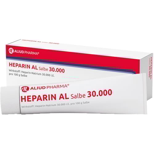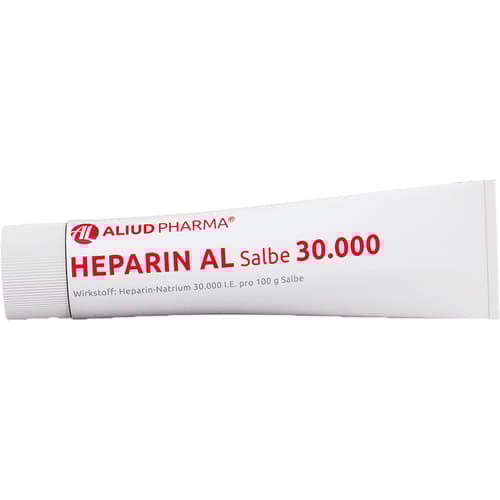 Heparin AL Salbe 30.000 Wirkstoff: Heparin-Natrium 30.000 I.E. pro 100 g Salbe. Anwendungsgebiete: zur unterstützenden Behandlung bei akuten Schwellungszuständen nach stumpfen Verletzungen (Prellungen/Blutergüsse).Zu Risiken und Nebenwirkungen lesen Sie die Packungsbeilage und fragen Sie Ihre Ärztin, Ihren Arzt oder in Ihrer Apotheke.