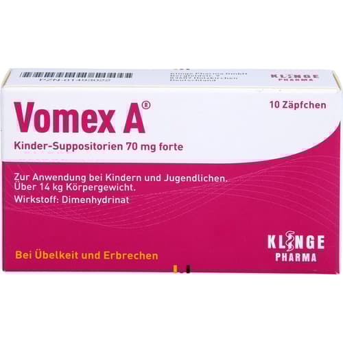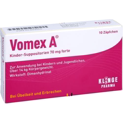 Vomex A Kinder-Suppositorien, 40 mg forte. Wirkstoff: Dimenhydrinat. Anwendungsgebiete: zur Vorbeugung und Behandlung von Übelkeit und Erbrechen unterschiedlichen Ursprungs. Dank niedriger Dosierung mit 40 mg schon für Kleinkinder geeignet. Das Zäpfchen mit 70 mg ist für Kinder über 15 kg Körpergewicht.Zu Risiken und Nebenwirkungen lesen Sie die Packungsbeilage und fragen Sie Ihre Ärztin, Ihren Arzt oder in Ihrer Apotheke.