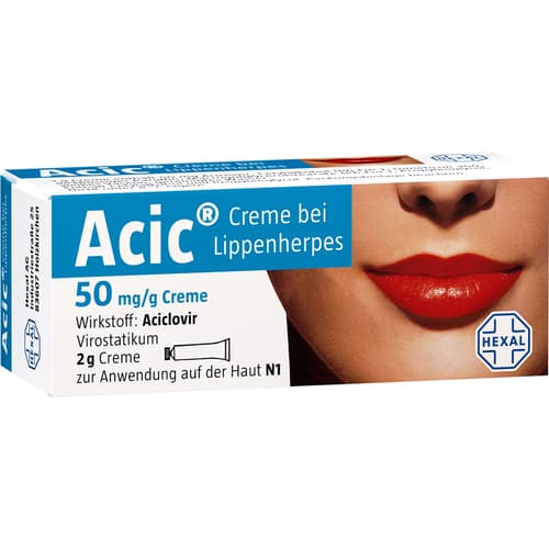 Acic Creme bei Lippenherpes 50 mg/g Creme. Wirkstoff: Aciclovir. Anwendungsgebiete: zur lindernden Behandlung von Schmerzen und Juckreiz bei häufig wiederkehrenden Herpesinfektionen mit Bläschenbildung im Lippenbereich (rezidivierender Herpes labialis).Zu Risiken und Nebenwirkungen lesen Sie die Packungsbeilage und fragen Sie Ihre Ärztin, Ihren Arzt oder in Ihrer Apotheke.