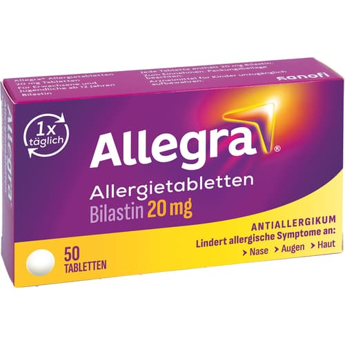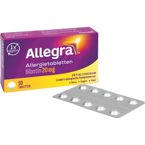 Allegra Allergietabletten 20 mg Tabletten. Wirkstoff: Bilastin. Anwendungsgebiete: Allegra Allergietabletten werden angewendet, um die Beschwerden von allergischer Rhinokonjunktivitis (Niesen, juckende, laufende, verstopfte Nase und rote und tränende Augen) bei saisonalen Formen (z. B. Heuschnupfen) sowie bei ganzjährigen Formen (z. B. Hausstaubmilbenallergie) zu lindern. Sie können auch angewendet werden, um juckende Hautausschläge (Nesselsucht oder Urtikaria) zu behandeln.Zu Risiken und Nebenwirkungen lesen Sie die Packungsbeilage und fragen Sie Ihre Ärztin, Ihren Arzt oder in Ihrer Apotheke.