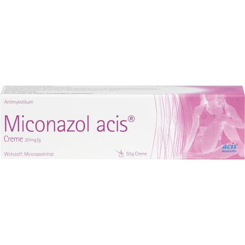 Miconazol acis Creme 20 mg/g. Wirkstoff: Miconazolnitrat. Anwendungsgebiete: bei Pilzerkrankungen der Haut, Hautfalten, Finger- und Zehenzwischenräume sowie oberflächlichen Infektionen durch Hefepilze.Zu Risiken und Nebenwirkungen lesen Sie die Packungsbeilage und fragen Sie Ihre Ärztin, Ihren Arzt oder in Ihrer Apotheke.