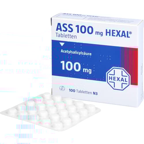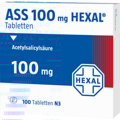ASS 100 mg Hexal Tabletten. Wirkstoff: Acetylsalicylsäure. Anwendungsgebiete: bei instabiler Angina pectoris (Herzschmerzen aufgrund von Durchblutungsstörungen in den Herzkranzgefäßen) - als Teil der Standardtherapie; bei akutem Herzinfarkt - als Teil der Standardtherapie; zur Vorbeugung eines weiteren Herzinfarktes nach erstem Herzinfarkt (zur Reinfarktprophylaxe); nach Operationen oder anderen Eingriffen an arteriellen Blutgefäßen (nach arteriellen gefäßchirurgischen oder interventionellen Eingriffen, z.B. nach aortokoronarem Venen-Bypass [ACVB], bei perkutaner transluminaler koronarer Angioplastie [PTCA]); zur Vorbeugung von vorübergehender Mangeldurchblutung im Gehirn (TIA: transitorisch ischämische Attacken) und Hirninfarkten, nachdem Vorläuferstadien (z.B. vorübergehende Lähmungserscheinungen im Gesicht oder der Armmuskulatur oder vorübergehender Sehverlust) aufgetreten sind.Zu Risiken und Nebenwirkungen lesen Sie die Packungsbeilage und fragen Sie Ihre Ärztin, Ihren Arzt oder in Ihrer Apotheke.