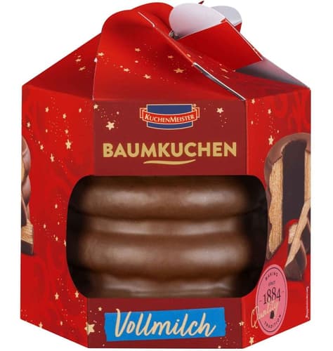 Baumkuchen sind eine besondere Spezialität des Hauses Kuchenmeister. Nach traditionellem Rezept werden dafür dünne Teigschichten nacheinander vor offener Flamme gebacken und zum Abschluss mit feiner Vollmilchschokolade umhüllt.
