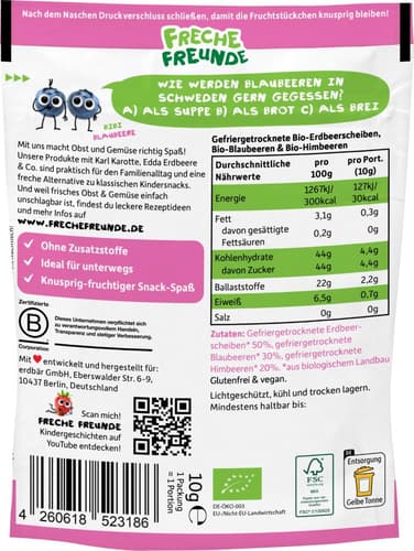 100% Bio-Beeren, kein Fett, kein Zuckerzusatz (Zutaten enthalten von Natur aus Zucker) & ideal für unterwegs - dank schonender Gefriertrocknung & Wiederverschließbarkeit für die starke Beerenbande kein Problem! Mit den knackigen Fruchtchips von Freche Freunde ist fruchtiger Bio-Snackspaß garantiert! Lichtgeschützt, kühl & trocken lagern Nach dem Naschen Druckverschluss schließen, damit die Fruchtstückchen knackig bleiben! Ohne Altersempfehlung