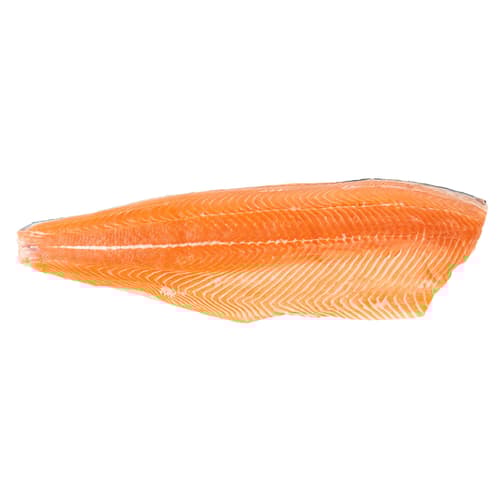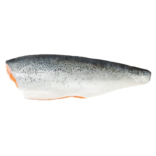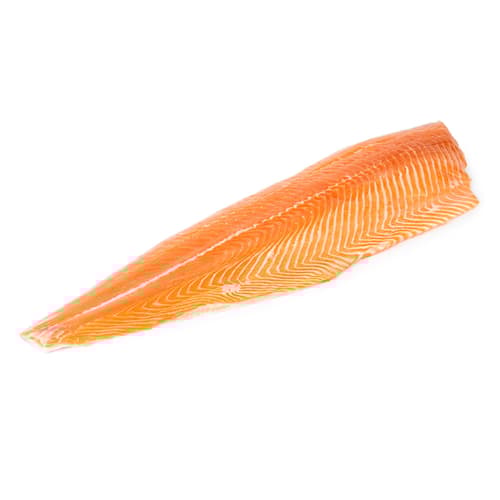 1 Stück Lachsfilet mit Haut ist im Trim C (mit Bauchlappen und Schwanzstück) zugeschnitten.