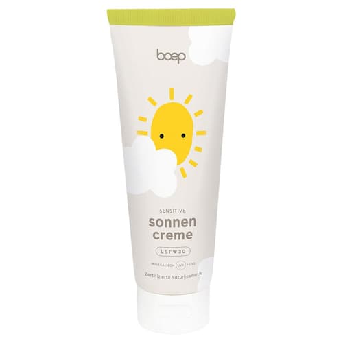 Die boep Sonnencreme Sensitiv LSF 30 ohne Parfum schützt die sensible Haut von Babys und Kindern mit einem rein mineralischen Zinkoxid-Filter. Diese zertifizierte Naturkosmetik aus Deutschland ist vegan, dermatologisch "sehr gut" getestet und riffkonform, da sie auf chemische UV-Filter verzichtet. Die 100ml-Creme lässt sich wunderbar verteilen und schützt sofort.