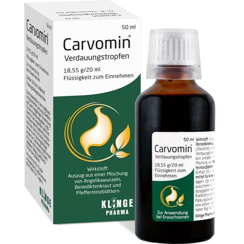 Carvomin Verdauungstropfen, Flüssigkeit. Wirkstoff: Auszug aus einer Mischung von Angelikawurzeln, Benediktenkraut und Pfefferminzblättern. Anwendungsgebiete: traditionelles pflanzliches Arzneimittel zur Unterstützung der Verdauungsfunktion bei Erwachsenen. Warnhinweis: Enthält 58 Vol.-% Alkohol!Quelle: Angaben der Packungsbeilage