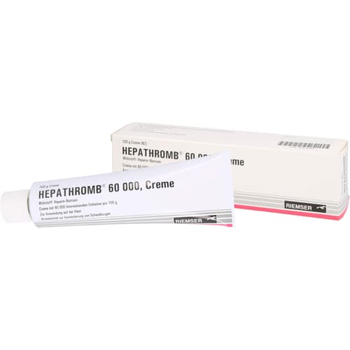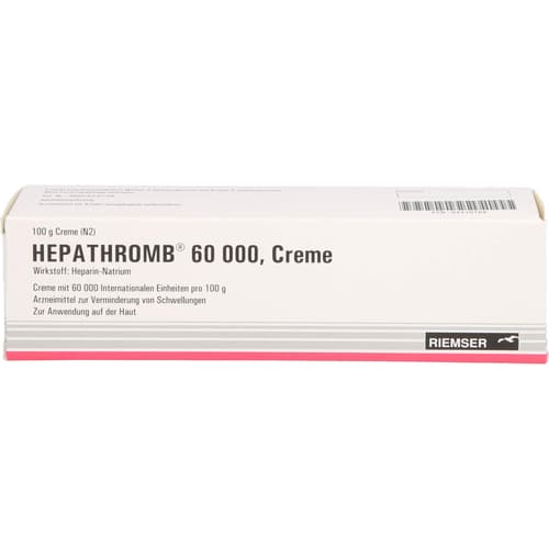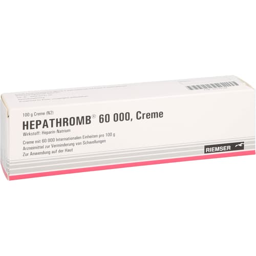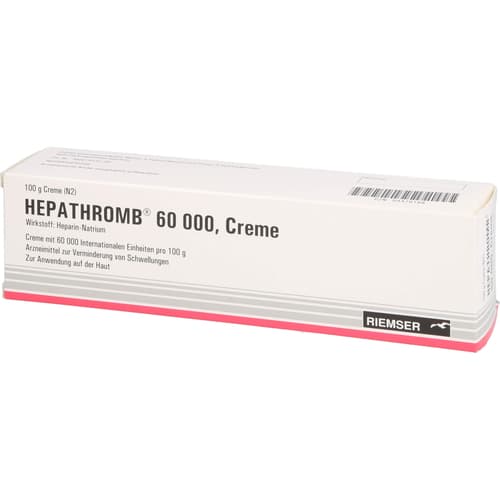 Hepathromb 60.000, Creme. Wirkstoff: Heparin-Natrium. Anwendungsgebiete: zur unterstützenden Behandlung bei akuten Schwellungszuständen nach stumpfen Verletzungen (Verstauchungen, Prellungen). Warnhinweis: Enthält Cetylstearylalkohol.Zu Risiken und Nebenwirkungen lesen Sie die Packungsbeilage und fragen Sie Ihre Ärztin, Ihren Arzt oder in Ihrer Apotheke.