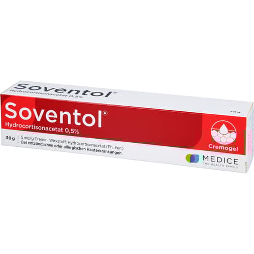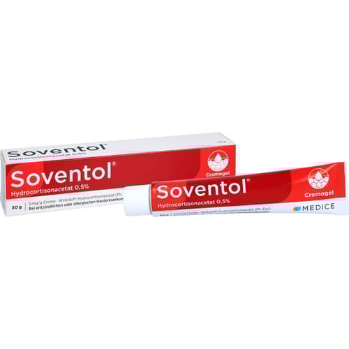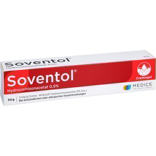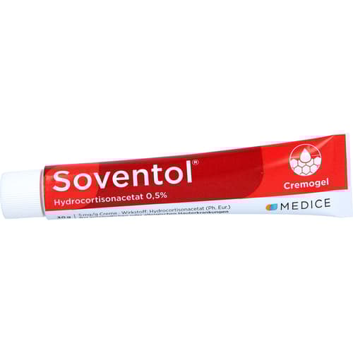Soventol HydroCortisonacetat 0,5% 5 mg/g Creme. Anwendungsgebiete: bei mäßig ausgeprägten geröteten entzündlichen oder allergischen Hauterkrankungen, bei denen schwach wirksame, niedrig konzentrierte Corticosteroide angezeigt sind.Zu Risiken und Nebenwirkungen lesen Sie die Packungsbeilage und fragen Sie Ihre Ärztin, Ihren Arzt oder in Ihrer Apotheke.